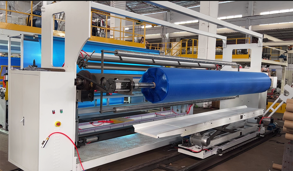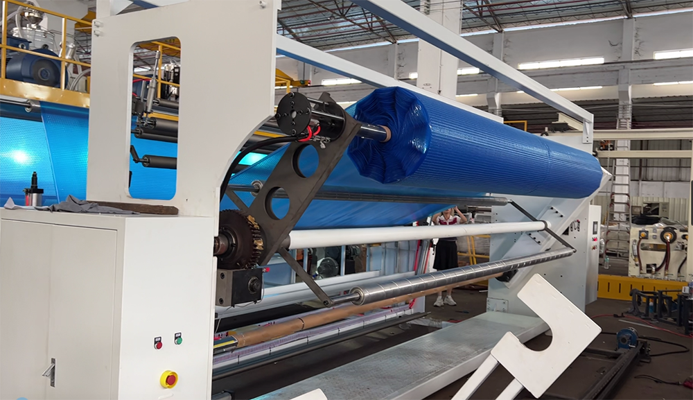 同时,我们在气泡膜机的生产线上集成了反向收卷机构,这一创新设计与气泡膜机的其他系统协同工作,使气泡在收卷过程中保持外部朝向。这一功能的实现,离不开气泡膜机先进的控制系统和精密的机械结构。通过气泡膜机的反向收卷机构,生产出来的气泡膜泳池布可直接进入销售环节,无需额外加工工序,大大提高了生产效率。