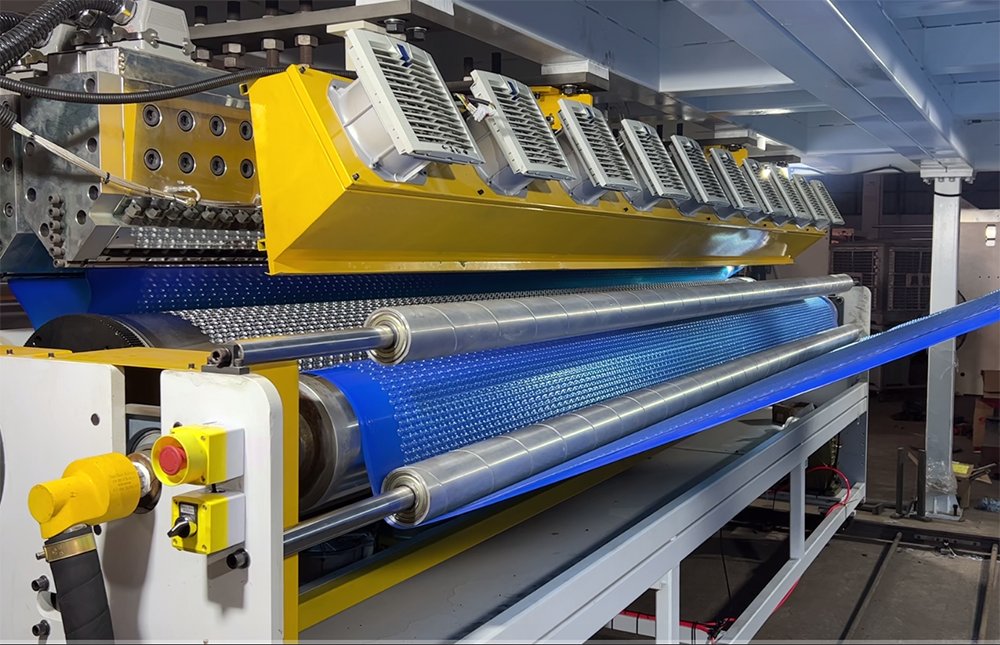 要生产出这样超级宽度的气泡膜泳池布,气泡膜机的性能起着决定性作用。我们的气泡膜机在面对这一挑战时,展现出了卓越的能力。针对宽度引发的材料不均问题,我们在气泡膜机上安装了具备微米级公差控制的精加工膜头,这一关键部件与气泡膜机完美配合,确保熔体在 4.2 米全幅范围内实现均匀分布。正是因为气泡膜机拥有如此精准的控制能力,才能让这一技术得以顺利应用,为解决材料均一性问题提供了坚实的保障。