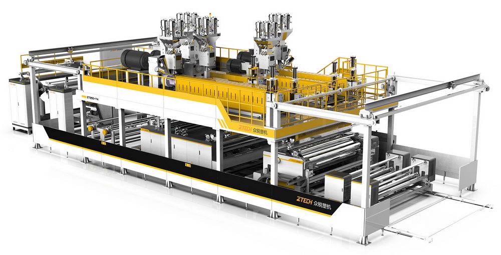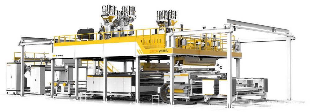 共挤ABA气泡膜包装机由主挤出系统、成型系统、收卷系统和电控系统组成。主挤出系统通过3个单螺杆分别控制PE层、PP层和气泡层。每层可分别控制厚度和流量,确保更好的产品质量。