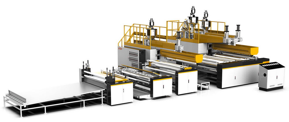 该生产线由成型、复合、去应力、切边、切断等部分组成,各部分配有变频器无级调速,整条生产线可同步调整。该生产线具有操作维护方便、易损件购买方便、产品质量可靠等特点。