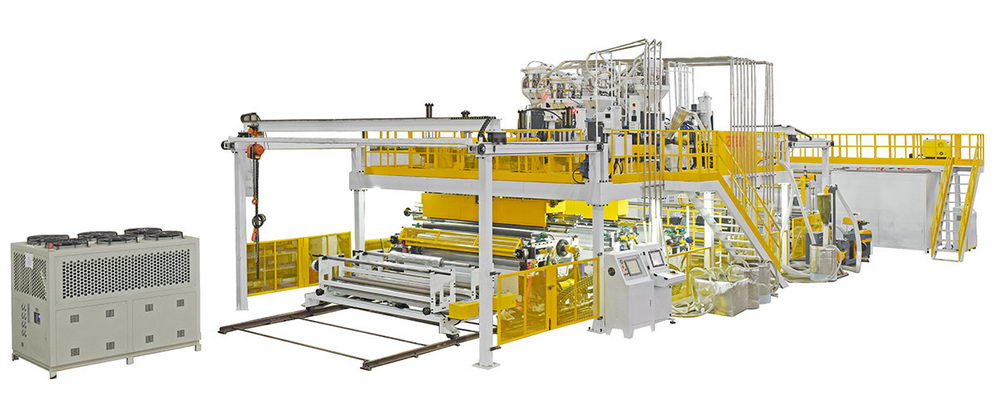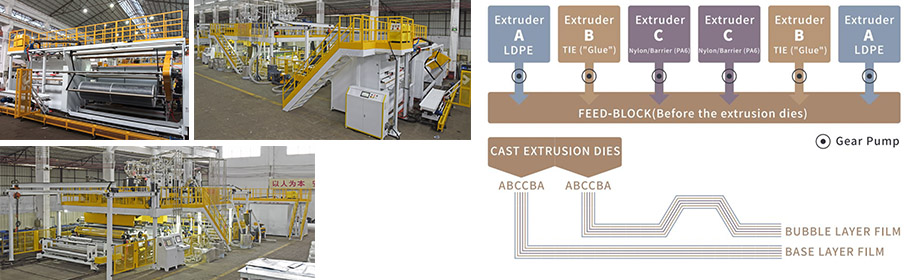 尼龙共挤气泡膜机由主挤出系统、成型系统、收卷系统和电控系统组成。主挤出系统通过6个单螺杆分别控制PE层、EVA层和尼龙层。每层可分别控制厚度和流量,确保更好的产品质量。