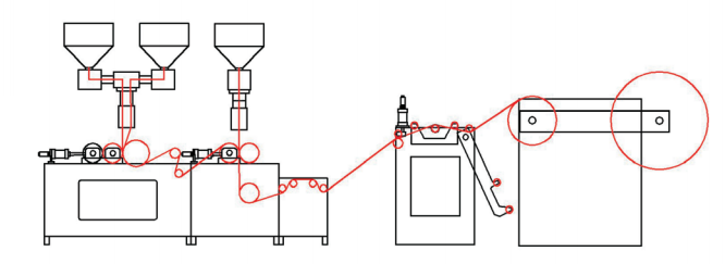 三层气泡膜挤出机主要以LDPE、LLDPE或再生料为原料。原料首先通过主挤出机的双螺杆在非常高的温度下挤出,制成气泡膜。接下来,这些气泡膜通过二次挤出系统添加了额外的 PE 膜。与单螺杆挤出机相比,气泡层和基层的厚度可以单独控制,从而节省材料成本。各种配方可用于生产各种颜色的气泡膜。这台机器的特点是运行非常稳定。